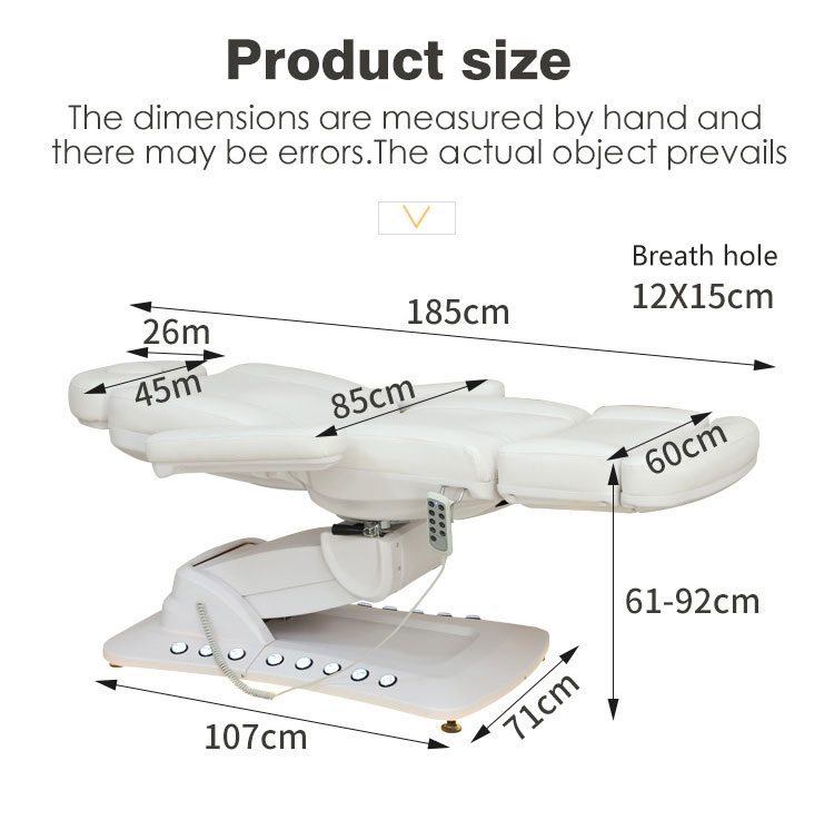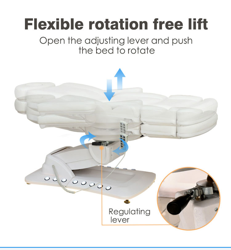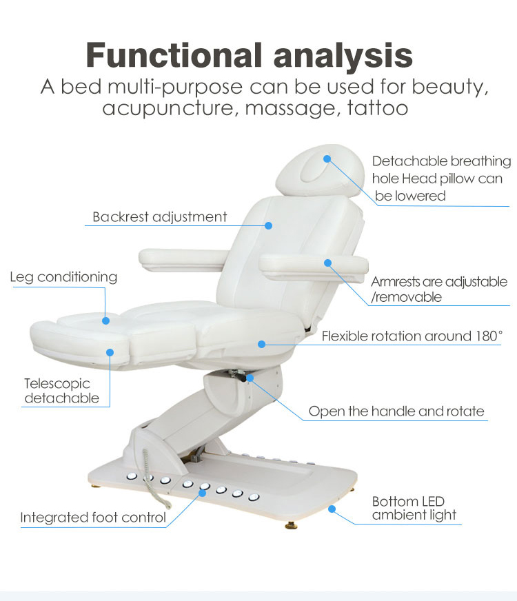 Katil Rawatan Elektrik mempunyai empat fungsi utama: Fungsi Boleh Laras Ketinggian. Kaki Atas dan Bawah, Sandaran Atas dan Bawah, kecondongan keseluruhan. Ia juga mempunyai kawalan kaki dan cahaya persekitaran.